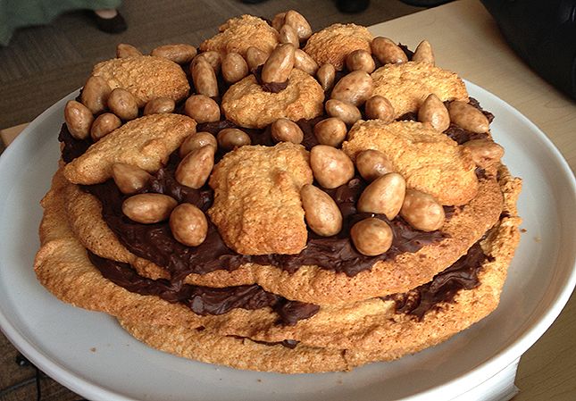 Ha megvagyunk a tortalapokkal, akkor egyszerűen összeállítjuk a tortát, egy réteg tortalap, rá a krém, egészen az utolsó szintig, ahova a mandulás csókokat pakoljuk. Ha van kedvünk, akkor még tehetünk rá extra mandulát.