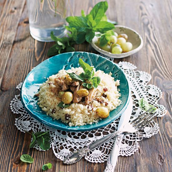 A csirkecombfilét felcsíkozzuk, sózzuk. A vajon megdinszteljük az apróra vágott vöröshagymát, majd rádobjuk a csirkehúst. Kb. 10 perc sütés után hozzáadjuk a megmosott szőlőszemeket, a fűszereket, illetve a vágott menta felét, majd 5 perc alatt készre főzzük. (Ha kezdene letapadni, egy kis vízzel pótoljuk az elfőtt levet.) Közben a kuszkuszhoz másfélszeres mennyiségű (kb. 3,5 dl) vizet felteszünk forrni. Beletesszük a mazsolát, 5 percig főzzük, majd levesszük a tűzről, enyhén megsózzuk, és belekeverjük a kuszkuszt, illetve az olajat. Lefedjük, és 5 percig állni hagyjuk. Tálaláskor a maradék mentát a húshoz keverjük, majd a kuszkuszra tálaljuk.