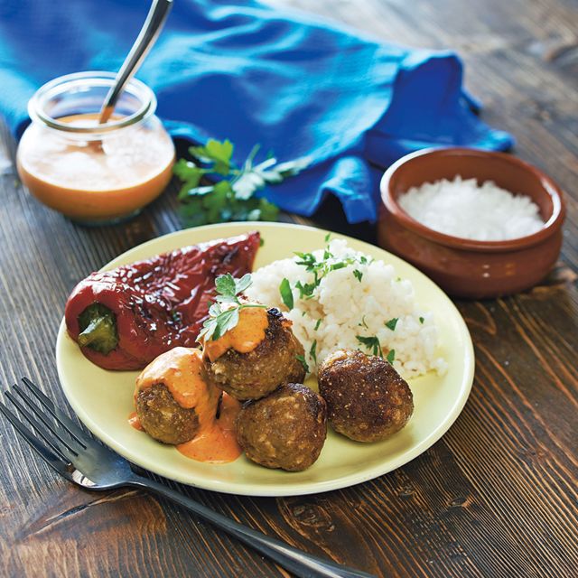A darált húst keverjük össze a fűszerpaprikával, kevés sóval és borssal. Adjuk hozzá a kukoricadarát és a tojást, majd reszeljük hozzá nagy lyukú reszelőn a sajtot. Dolgozzuk jól össze, hagyjuk 15 percet állni, majd formáljunk belőle kis gombócokat, és kevés olajon kb. 6-8 perc alatt süssük készre. A megmosott kápia paprikákat kevés olajon süssük minden oldalukon 2-3 percig. Szedjük ki egy tálra őket, és 2 percre takarjuk le fóliával, hogy felpuhuljon a párától a bőrük. (Ezután könnyen tudjuk majd meghámozni őket.) Szedjük ki a szárát és a magházát is, majd a majonézzel együtt turmixoljuk össze a paprikahúst. Kínáljuk a csirkegolyók mellé, adhatunk mellé főtt krumplit, rizst.