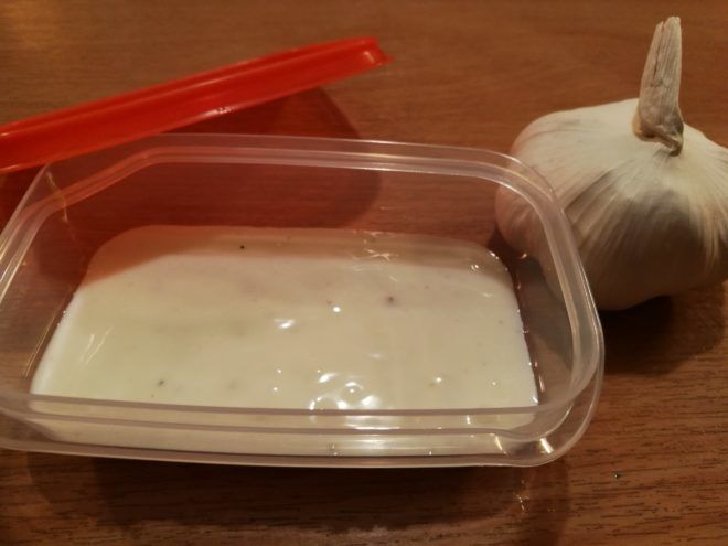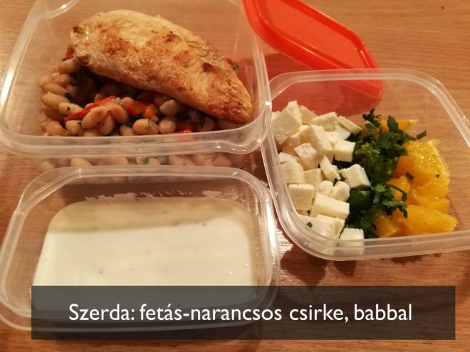Hogy legyen mit a salátámra tenni, a joghurtos pácból (joghurt, pici fokhagyma, kevés márványsajt) kitettem egy kis dobozba, hétfőn, kedden ezt öntöm rá. Szerdától pedig az úgynevezett „benti salátaöntetemet” fogom használni. A fiókomban egy kis üvegben ott áll egy mustáros-mézes-olívás öntet, amit még korábban kevertem be. Olyan jólesik, hogy csak előkapom a fiókból, és van finom cuccom a salátákra. Ezt azért is készítettem el, mert meguntam, hogy a menzán vagy üres olívaolaj van, vagy bolti majonézes öntetek, bocs, de azoktól kitör a frász.