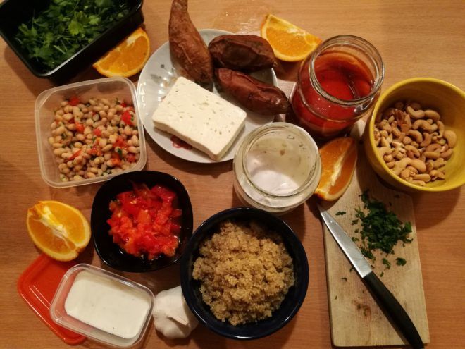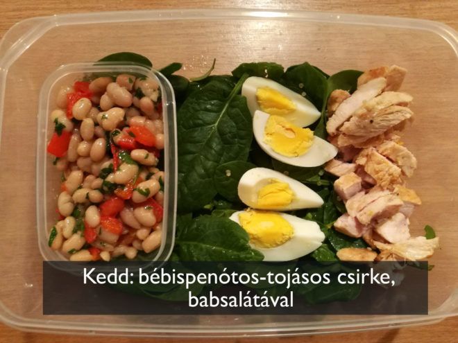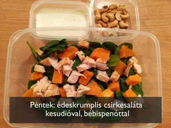 Itt vannak a klassz finomságaink előkészítve. Ezek után nincs más dolgod, mint megsütni egy-egy csirkemellet reggel vagy előző este. És a hűtőben tárolt alapanyagokból összeállítani az aznapi salátádat. Kicsit aggódtam, hogy nem fogok majd jóllakni, de szuperül ki vannak találva az összetevők. Gondolj bele, mennyire laktató már magában csak az édeskrumpli, de a quinoa meg az olajos magvak is! Bedobozolom őket, és evés előtt a dobozban vagy egy tányéron szépen összekeverem az egészet a kiválasztott öntettel. Én például a babsalátát és az édeskrumplit megmelegítve dobom a salátába, de azt döntsd el te, hogyan szereted a legjobban. Mutatom, mit fogsz enni a héten: