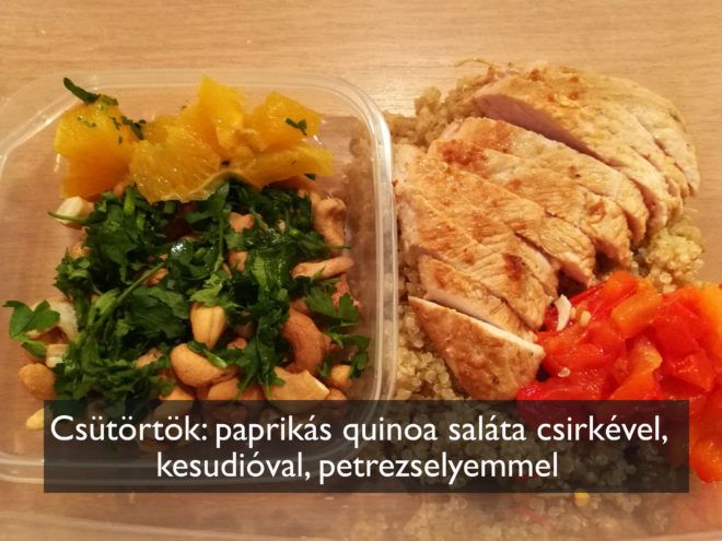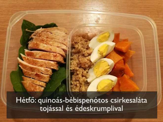 Egy fél bögre quinoát főztem meg, hogy pontosan hogyan kell, itt találod. Ezt is rakd egy dobozba, és majd innen adagolhatod a napi salátádhoz.