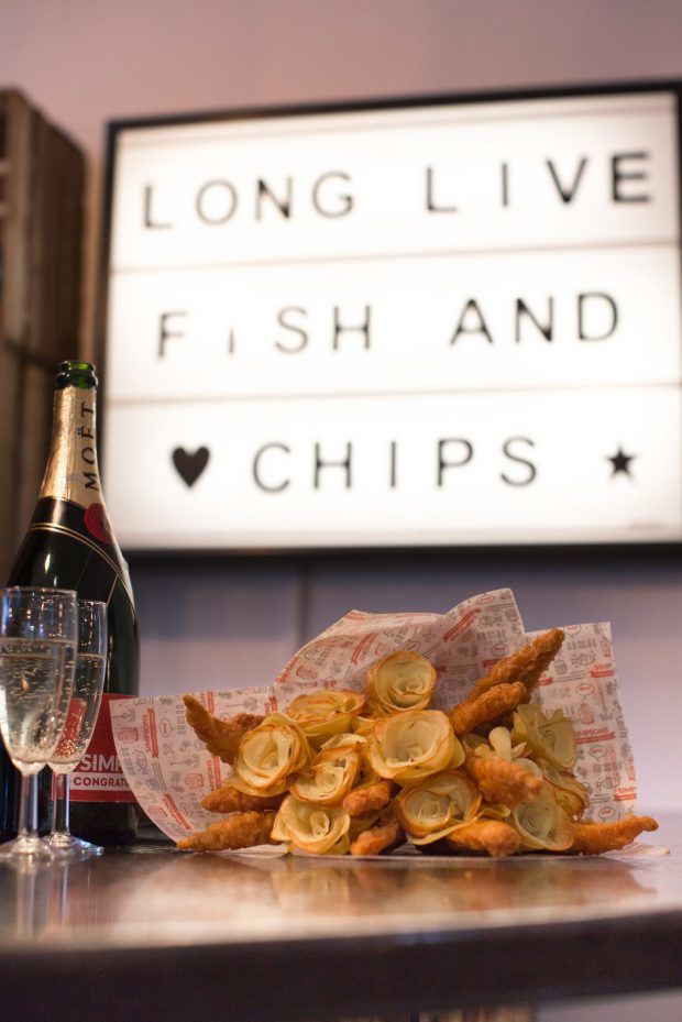 Valentin-napon a csoki és a virág számít örök slágerajándéknak, de idén kreatív és egyedi módon ötvözhetjük a fogyaszthatóságot és az esztétikumot. A cheltenhami Simpsons fish and chips étterme a britek kedvenc kajáját, vagyis a sült krumplival kínált, sörtésztában kisütött rántott halat rendezi szemet gyönyörködtető csokorba, ami nemcsak elég szép, de jó guszta is.