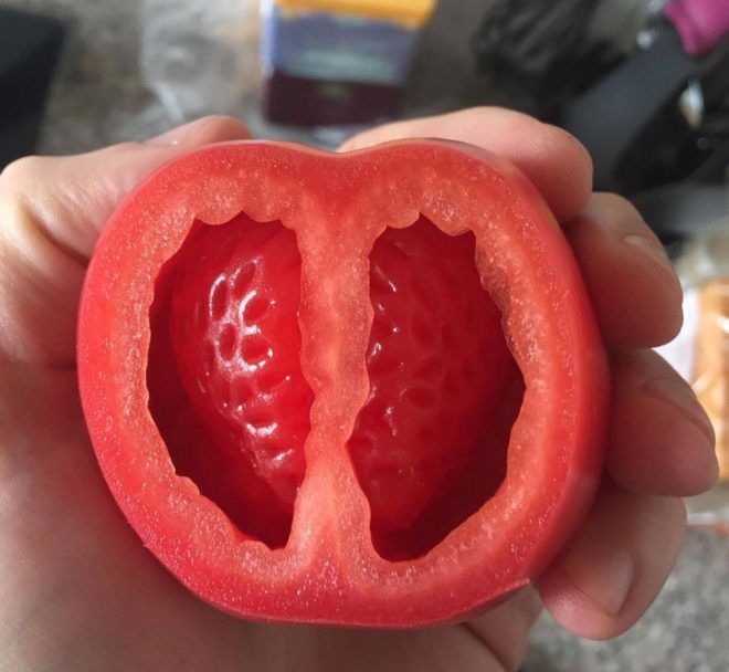 Mintha egy eper köré nőtt volna az a paradicsom, melynek a fotóját a minap töltötte fel a CroixBeans nicknevű felhasználó a Redditre.