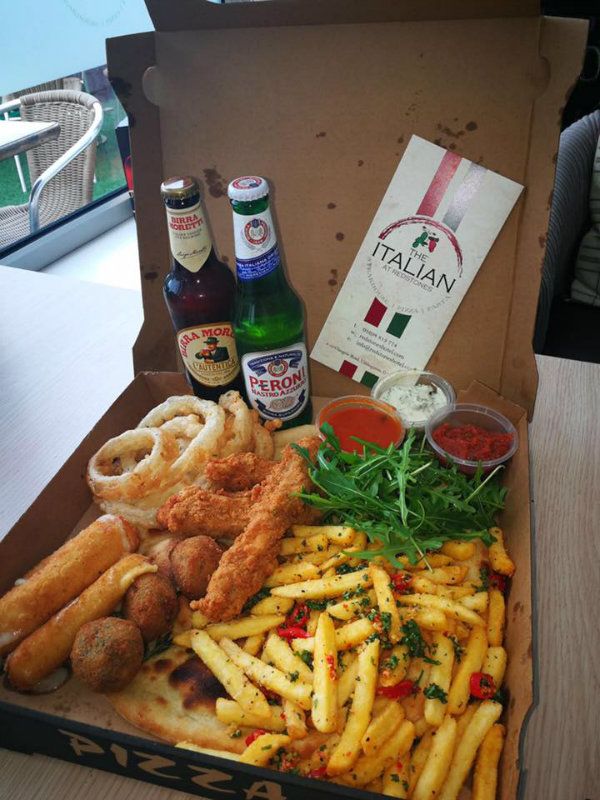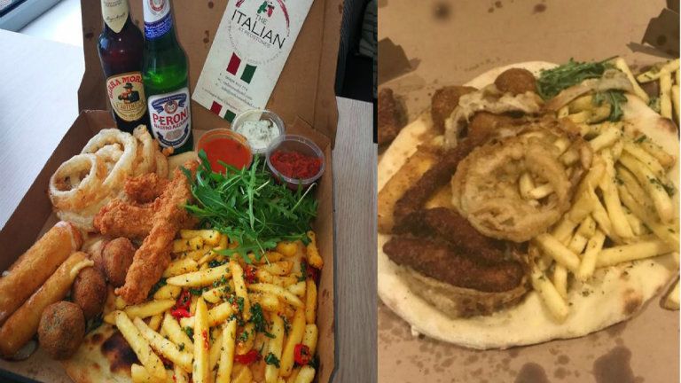 A skóciai lanarkshire-i The Italian at Redstone étterem múlt héten gusztusos fotót tett ki a Facebook-oldalára, melyben új, házhoz szállításra tervezett ételüket reklámozták. A dobozban a fotó tanúsága szerint arancini-golyók, mozarella-rudak, csirkemell falatkák, hagymakarikák, illetve focaccia kenyér, fűszeres sült krumpli és háromféle szósz található.