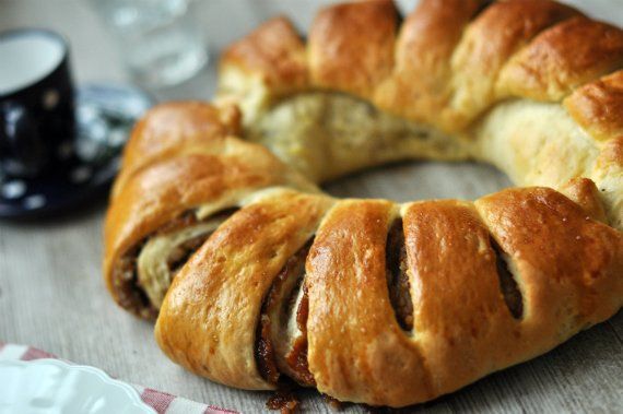 A megkent tésztalapot 6 csíkra vágjuk, majd az így kapott csíkokat egymásra rakjuk. Ezt az emeletes tésztát 6 darabja vágjuk, majd az így kapott kb. négyzetes lapokat „élükkel” az előkészített püspökkenyérformá(k)ba állítjuk. Meglocsoljuk a maradék töltelékkel a tetejét, és pihentetjük 30 percig. 175 fokos sütőben kb. 25-30 percig sütjük, majd egészben kivesszük a formából, és aztán tépkedjük egyik szeletet a másik után.
