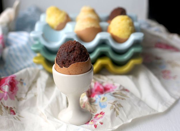 A tojásokat a lehető legalaposabban megmossuk, majd úgy törjük fel, hogy csak a tetején ütünk egy nagyjából 1 centis lyukat. Később ezen a nyíláson töltjük be a masszát. A tésztához bármilyen muffinalaprecept jó lesz, a lényeg, hogy ne legyenek benne szilárd darabok (csokipasztilla, mogyoró, karamell). Az elkészített tésztát töltsük zacskóba, majd a tojáshéjon lévő lyukon keresztül háromnegyedig töltsük a tésztával a héjakat. 170 fokra előmelegített sütőben 15 perc alatt süssük készre a „tojásokat”, majd tűpróbával ellenőrizzük, hogy átsült-e. Hagyjuk kihűlni, majd tegyük tojástartóba, a tetejét egy kicsit törjük meg, és így tálaljuk.
