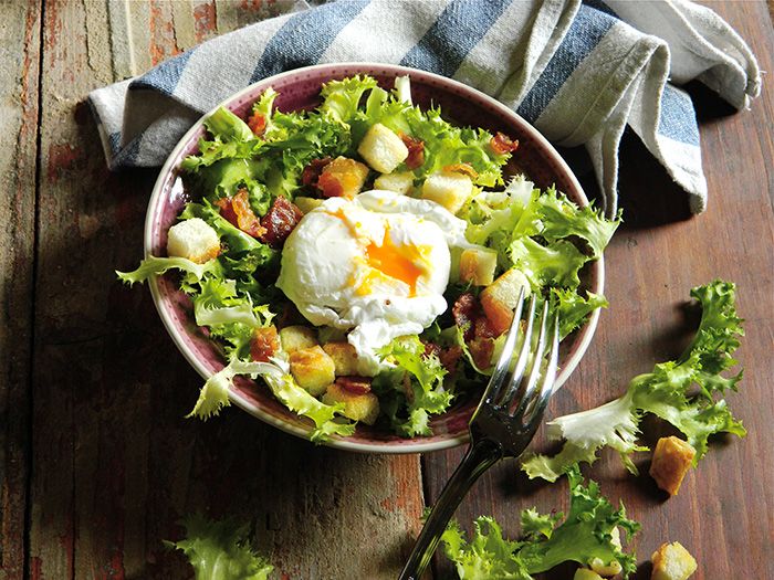 Egy keverőtálban négy evőkanál ecetet keverjünk ki a mustárral. Sózzuk, borsozzuk, majd folyamatos kevergetés közben adagoljuk hozzá vékony sugárban az olajat, mintha majonézt készítenénk. Tépkedjük rá a salátát, vagy dobjuk rá a salátakeveréket. Közben egy vastag falú serpenyőben pirítsuk meg a szalonnát, legyen szép piros. Ennek a zsírján pirítsuk ropogósra a kockázott baguette-et is. Tálaláskor forgassuk össze a salátát a dresszinggel, halmozzuk tányérra. Osszuk el rajta a szalonnát és a kenyérkockákat, hintsük meg a friss petrezselyemmel, majd tegyük a tetejére a buggyantott tojásokat.