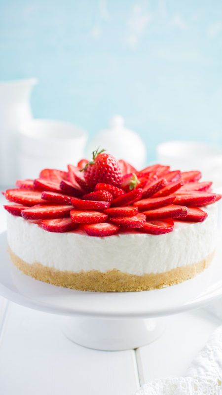 Öntsd a krémet a tortára, és egyengesd el egy spatulával a tetejét. Minimum 4 órára vagy egy egész éjszakára tedd hűtőbe. Tálald friss eperrel.