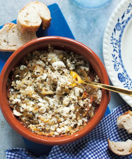 Két kis kerámiatálba (saganaki, innen kapta ez az ételtípus a nevét) osszuk szét a felkockázott fetát. Locsoljuk meg az olívaolajjal, szórjuk meg a fűszerekkel, és karikázzuk rá az erős paprikát. 220 ̊C-os sütőben 25 perc alatt süssük készre. Tartalmas előétel kenyérrel, de hús, hal mellé is kínálhatjuk salátával.