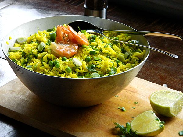 Öntsünk egy evőkanál olajat egy közepes lábosba, melegítsük meg, és keverjük hozzá a kurkumát. Borítsuk rá a rizst, öntsük rá az alaplevet, adjunk hozzá 3-4 csipet sót, dobjuk rá a félbevágott hagymát, és kezdjük el főzni. 1-2 percig kevergessük, majd lefedve, kis lángon 13-15 perc alatt puhára pároljuk. Félidőben adjuk hozzá a borsót, de ne keverjük bele. Hagyjuk kihűlni, legyen kézmeleg. Ekkor keverjük hozzá a tavaszi hagymát és a petrezselymet. Ízesítsük lime levével, sóval, borssal. A rákok pirításához egy vastag falú serpenyőt felmelegítek. Megolvasztom benne a vajat és az olajat, rádobom a pucolt rákokat, ízesítem sóval, borssal, fokhagymával, és alig 1 perc alatt, közepes lángon megpirítom őket. Ne süssük túl, mert rágós lesz a húsa. Frissen, a rizzsel tálalom.