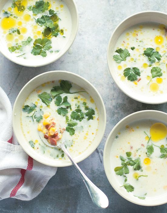 A hámozott, kockázott újkrumplit a darabolt újhagymával együtt tegyük fel főni 1 liter sós vízben. Ha megfőtt a krumpli, turmixoljuk össze a levest a tejföllel, sózzuk, borsozzuk, pár csepp citromlével ízesítsük, keverjük el benne a lecsöpögtetett kukoricát. A vékonyra szelt, majd kockázott sonkát kevés olívaolajon süssük ropogósra. A forró levest tálaláskor csepegtessük meg olívaolajjal, szórjunk bele sült sonkát és vágott koriander- vagy petrezselyemzöldet.