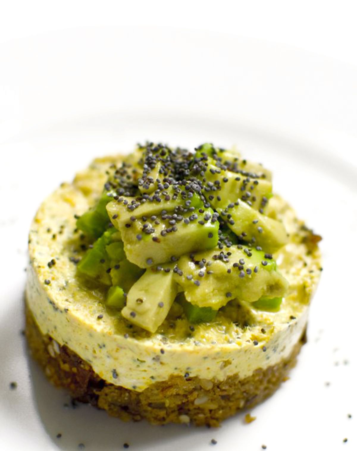Az alsó réteg hozzávalóit késes robotgépbe teszem, és felaprítom. Ha megmarkolom, és összetapad, akkor jó. Kisméretű formázógyűrűt vagy pogácsaszaggatót kiolajozok, majd egy tányérba nyomkodom a kenyeret a segítségével. A csirkehúst apró kockákra vágom, ha szükséges, majd elkeverem a többi hozzávalóval. Mehet bele újhagyma is, ha van otthon. Ez lesz a következő réteg, amit a kenyérre nyomkodok. Az avokádót felkockázom, meglocsolom lime-mal, olívaolajjal, és a csirkére halmozom. Meghintem mákkal. Természetesen szinte minden mindennel cserélhető: a mazsola datolyával vagy aszalt fügével, a csirke sonkával, az avokádó mangóval vagy érett körtével, vagy ami épp eszetekbe jut, és mentendő a kidobástól.