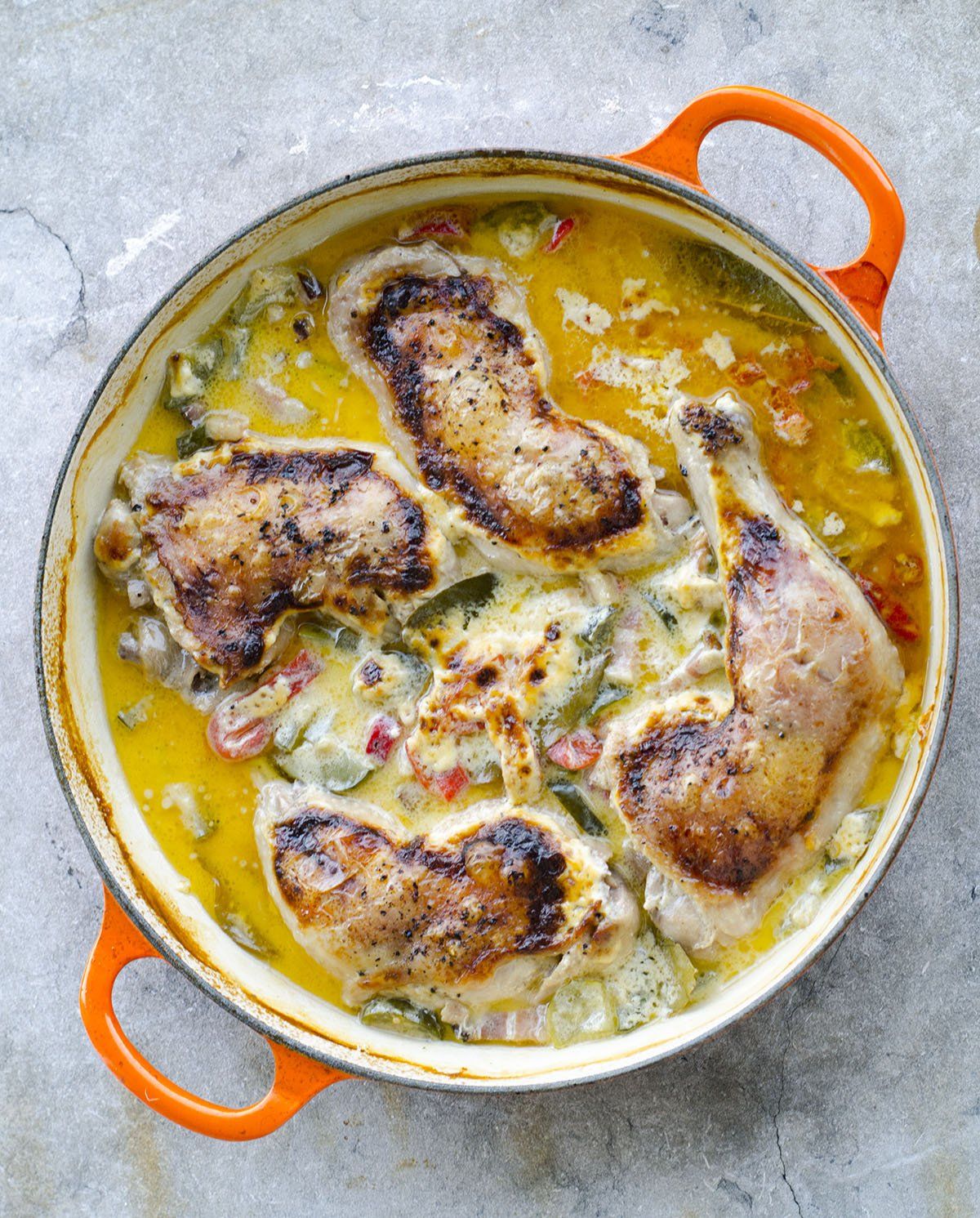 A paprikákat gázlángon vagy grill alatt feketére sütöm, dobozba teszem, majd lehúzom a héjukat. Ha nincs kedvünk ehhez, akkor használhatunk konzerv sült paprikát is –  annak sajnos nincs olyan erőteljes füstös íze, és általában kissé ecetes lében teszik el, de azért nagyon finom és időkímélő megoldás. (Török boltokban mindig kapható.) A csirkecombokat sózom, borsozom, majd a zsíron körbepirítom. Melléjük dobom a füstölt kacsamellet, a felcsíkozott paprikát, a felkarikázott kovászos uborkát, a fűszereket, a citromot, és felöntöm a borral. Lefedve párolom 45 percig. Ha elfőne a bor, akkor vízzel pótolom. Amikor a combok már vajpuhák, felöntöm a tejszínnel, és betolom a sütőbe grill alá, ahol rápirítok. Ez csak 2-3 perc, és akár el is maradhat.