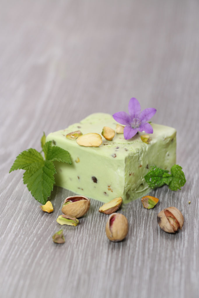 Daráld a pisztáciát durvára, vagy késsel vagdosd darabokra.Tűzálló edényben tedd föl melegedni a tejet és a tejszínt. Lassú tűzön forrásig hevítsd, közben fakanállal gyakran keverd meg. Amint felforrt, vedd le az edényt a tűzről, és keverd el benne a fölaprított pisztáciát és a vaníliát. Ha kihűlt a keverék, tedd egész éjszakára a mélyhűtőbe. Másnap a tojássárgákat keverd világosra a cukorral. A mélyhűtőből kivett tejszínes keverékhez óvatosan fakanállal add hozzá a tojássárgás cukrot. Nagyon lassan kezdd el ismét hevíteni a fagyit. Közben folyamatosan kevergesd, sűrűsödésig főzd. Vedd le az edényt a tűzről, hűtsd ki, majd legalább 2 órára tedd vissza a fagyasztóba. Fagylaltkészítő géppel is készítheted, akkor nincs szükség a fagyasztásra. A pisztáciafagylaltot tejszínhabbal, csokoládéreszelékkel kínálhatod, de természetesen önmagában is kitűnő.