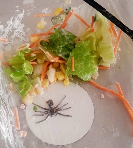 „Nézzétek, mit talált a lányom a salátájában!” – írta a fotóhoz, melyen egy hatalmas, öntetbe fulladt pók teteme hever a doboz alján.