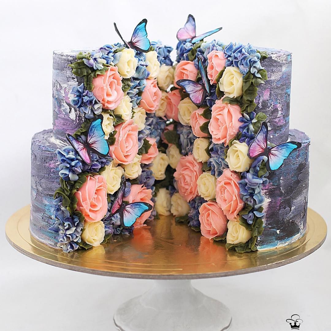 Van olyan tortája is, amelyet többtucatnyi tökéletesen elhelyezett rózsaszirom borít, a levekkel és pillangókkal pedig úgy néz ki, mintha egy titkos kert tárulna elénk.