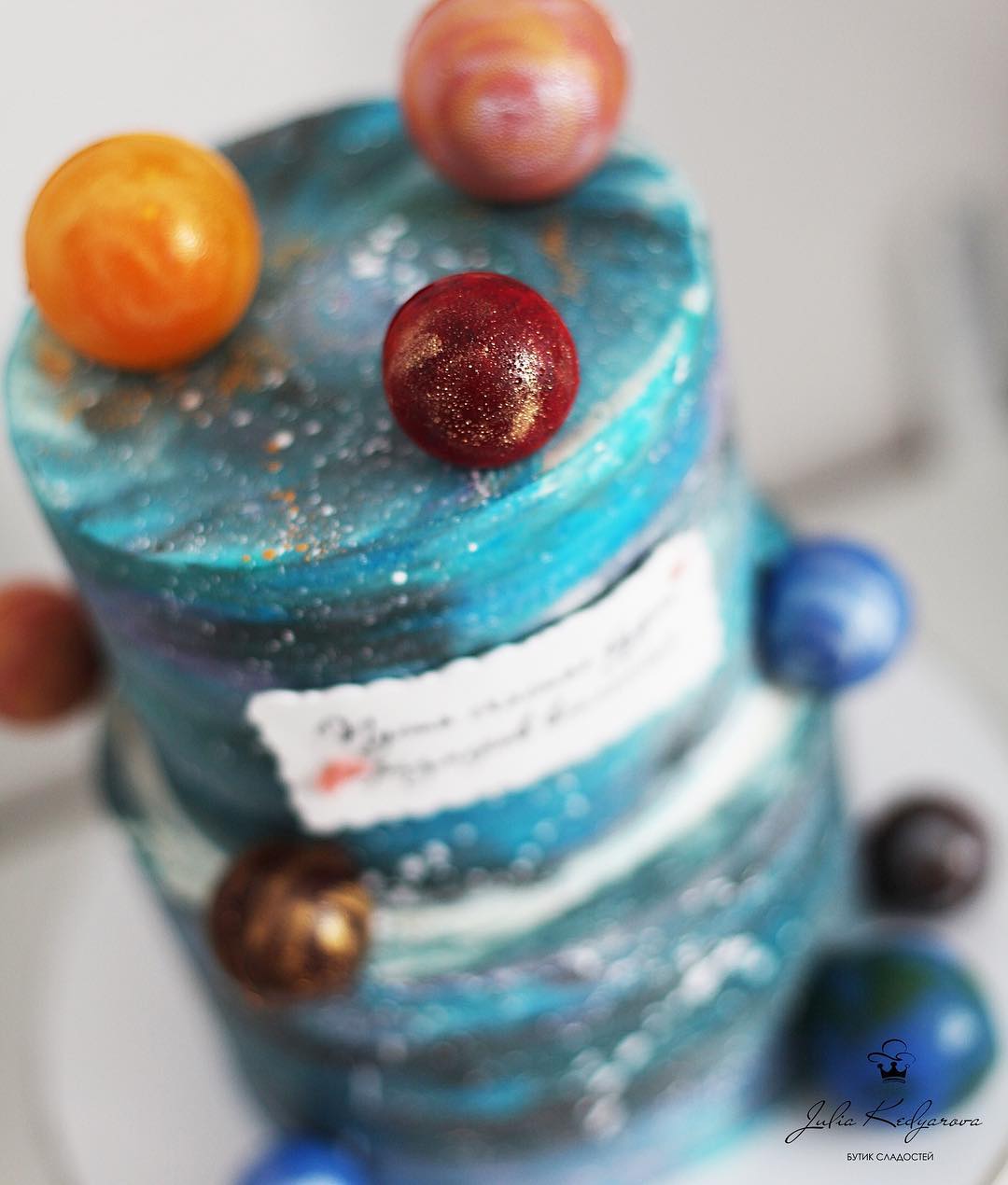 Egyik színpompás tortája egész galaxisokat idéz meg az asztalon, színes bolygókkal és örvénylő bevonattal.