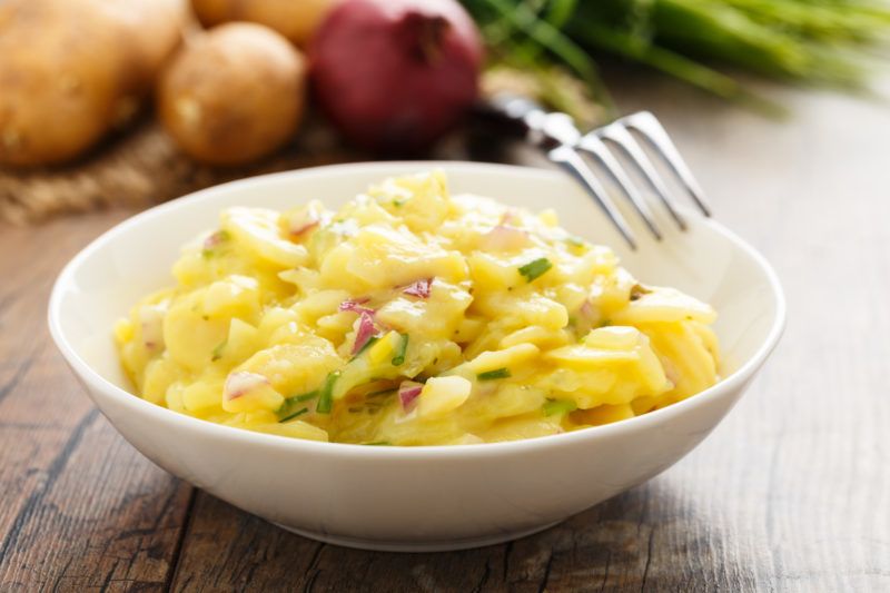 Hozzávalók: 1 kg főzni való krumpli, 2,5 deci húslé (húsleves a legjobb, de lehet csirkealaplé vagy zöldségalaplé), hagyma (eredetileg egy közepes fej vöröshagyma, de nyugodtan használjatok lila vagy fehér hagymát, sőt újhagymát vagy pórét, amit szerettek), egy-két gerezd zúzott fokhagyma, 4-5 evőkanál ecet (amilyet szerettek), egy kis porcukor, só, bors. Lehet tenni bele egy kisebb legyalult uborkát (fürtöst), ha ez nincs, elhagyható.