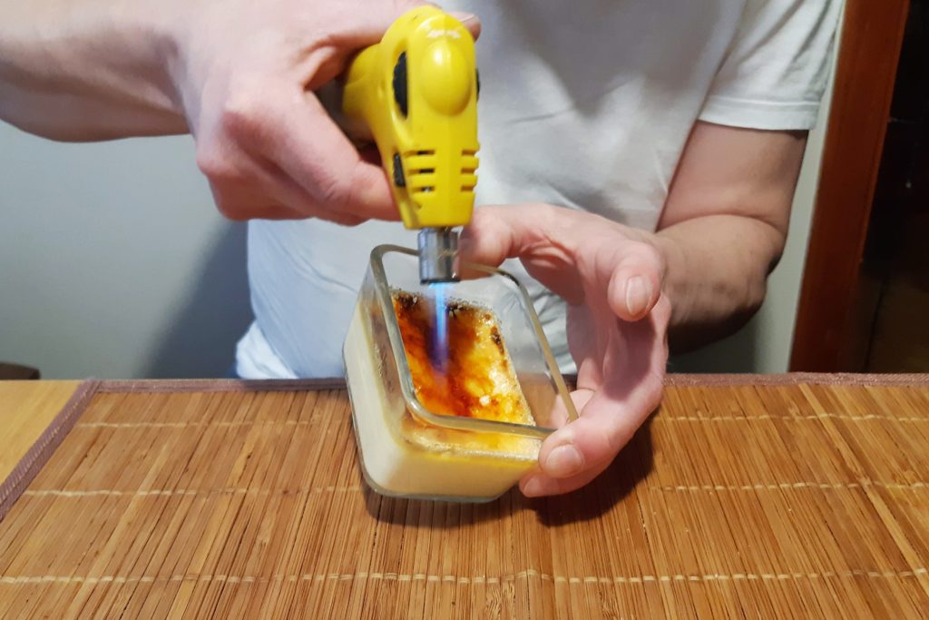 Másnap kezdődhet a buli. Az asztalnál a krémeket megszórjuk jó vastagon cukorral, majd karamellizálópisztollyal rásütjük. Nálunk általában hatalmas üdvrivalgást vált ki, amikor először megfolyik a cukor. Mire mind a négyünké elkészül, eltelik vagy húsz perc, amit együtt tevékenykedve, nevetgélve töltött a család. Ha mind megvan, kiskanállal rituálisan betörjük a krémünk tetején a kemény karamellréteget, és hatalmas elégedettséggel bekanalazzuk az egészet.
