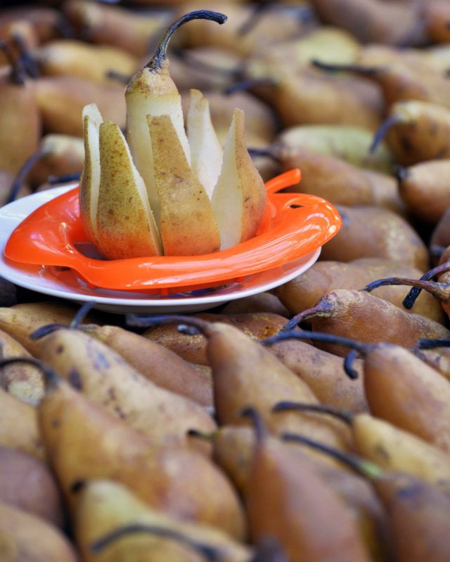 Kóstolásra kikészített körteszeletek a Kolosy téri termelői piacon (Fotó: Máthé Zoltán / MTI)