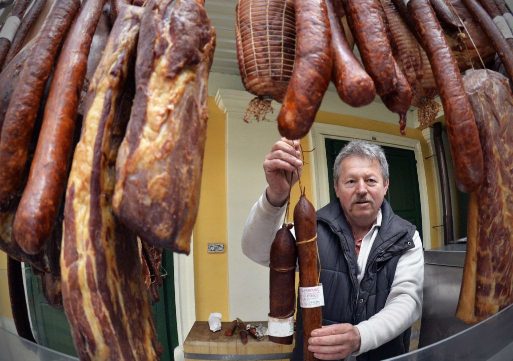 Kolbászokat kínál egy árus az óbudai Kolosy téri termelői piacon (Fotó: Máthé Zoltán / MTI)