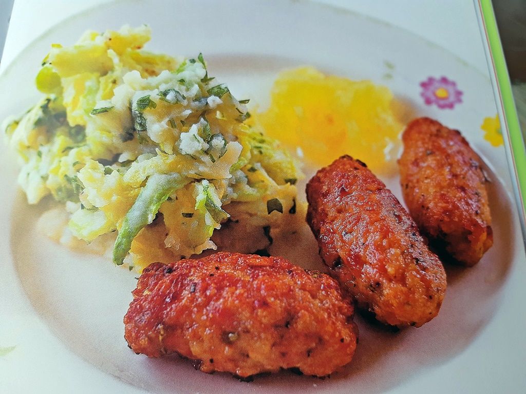 Rachel Allen anyukájának fűszeres kolbászkái káposztás krumplipürével, almaszósszal (fotó a receptkönyvből)