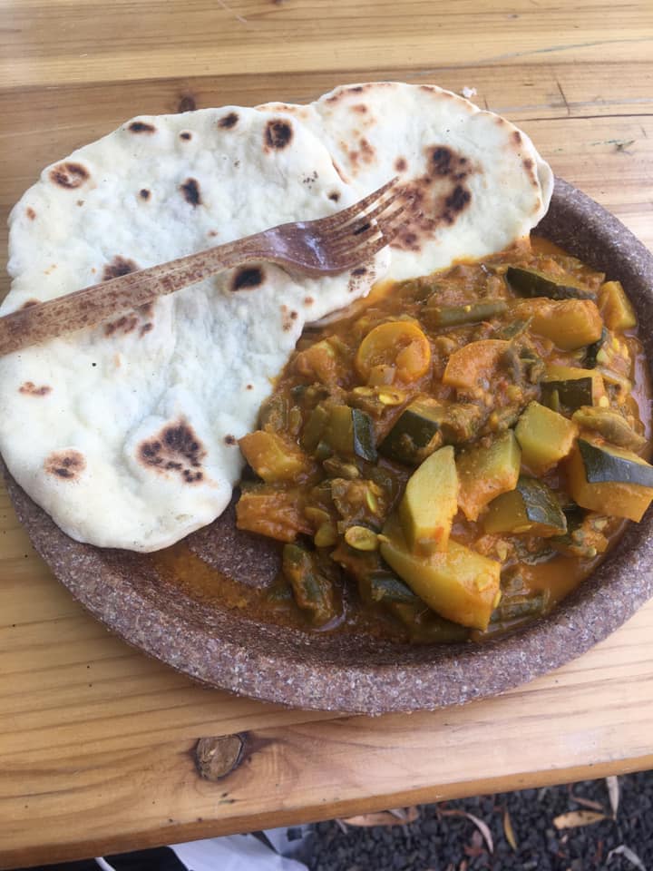 „A kis piacon vásároltuk a currys chiattny naan kenyérrel nevű finomságot, ezt búzakorpából készült ehető tányéron szolgálták fel nekünk, komposztálható evőeszközök kíséretében. Az étel isteni volt, persze megkóstoltuk a tányért is, melynek semleges íze nem befolyásolta az étel fűszeres zamatát”