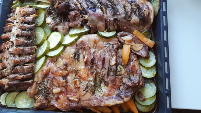 - Amikor már két és fél órája sül, köré tehetjük a feldarabolt cukkinit, édesburgonyát, padlizsánt, vagy amit elképzeltünk, és azzal együtt is sütjük még lefedve 30 percig.