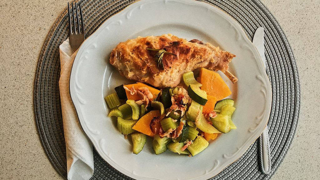 Nyúlcomb baconös sült zöldségekkel. A nyúlhús finom és egészséges (Fotó: Sós Borbála)