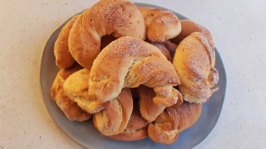 - Megszórjuk kristálycukorral (vagy fahéjas kristálycukorral) a deszkát, és a tésztadarabokat megsodorjuk-csavarjuk ellentétes irányban, majd kiflivé görbítjük. Mikor az összes tésztával végeztünk, letakarjuk, és még egyszer megkelesztjük a kifliket.