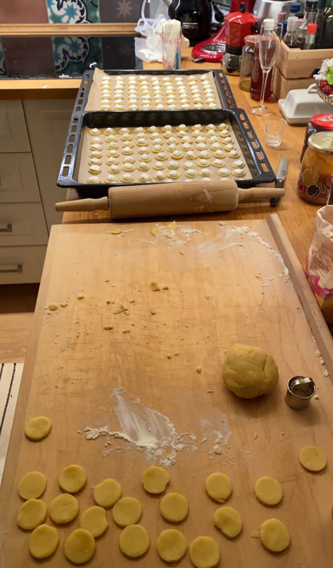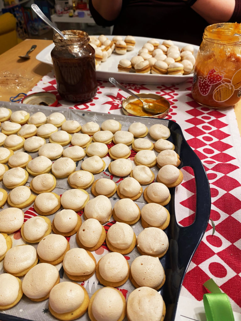 vagy a karácsonyról ránk maradt, extra rénszarvasos kiszúróval: kénytelenek vagyunk apró pogácsaszaggatóval dolgozni. Ez pedig el fog tartani egy darabig. Nem baj, legalább gyorsan megsül, mire az egyik tepsit megpakoljuk és a linzerek tetejére rápöffentjük a habot, a másik tepsivel már készen is van a sütőben, hurrá, már csak párosítani kell őket.