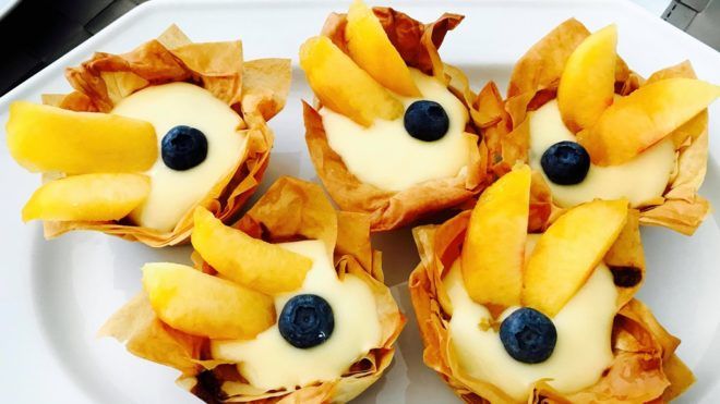 - Tálalás előtt friss gyümölcsökkel díszítjük a vaníliás kosárkákat.