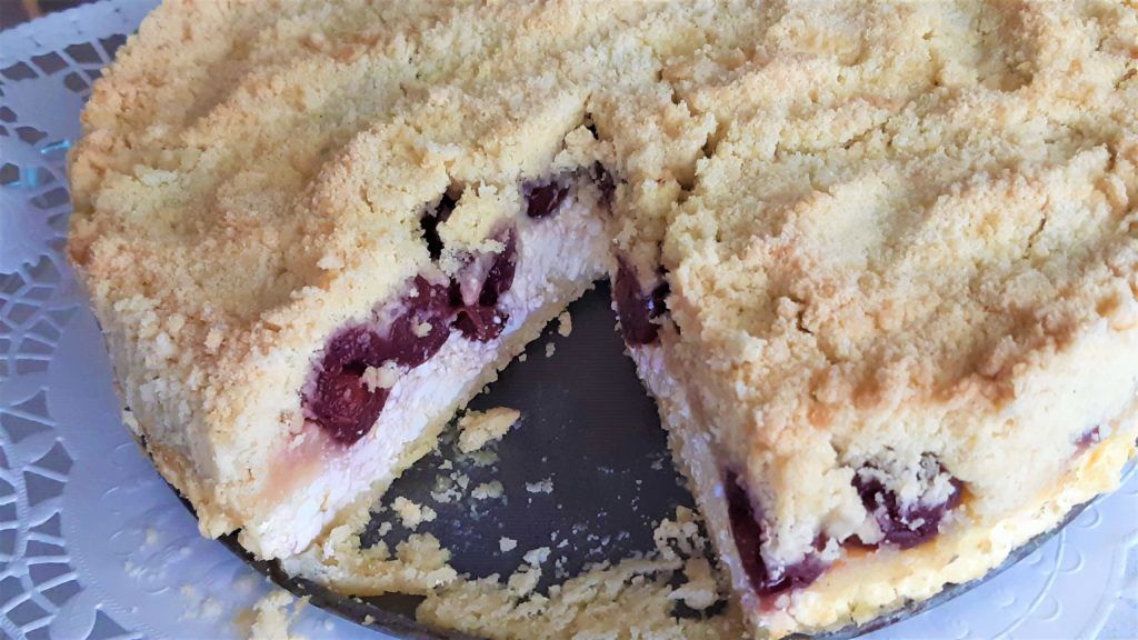 Morzsás túrós-meggyes pite