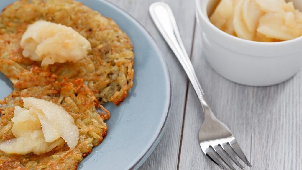 Reszeljük le a burgonyát és almát nagy lyukú reszelőn, majd hagyjuk állni. Pár perc elteltével nyomkodjuk ki a krumpli és az alma levét. Aprítsuk hozzá a petrezselymet. Adjuk hozzá a lisztet és egy csipetnyi sót, majd keverjük össze. Púpozott evőkanálnyi mennyiséget lapogassunk el a felhevített olajon a serpenyőben majd süssük aranybarnára. A tetejére halmozzunk almakompótot, vagy szórjuk meg porcukorral.