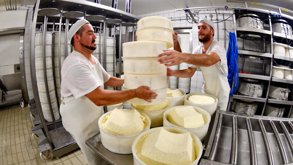 Morbier sajt készül egy üzemben, valahol Franciaországban (Fotó: Dominique Delfino/Biosphoto via AFP)