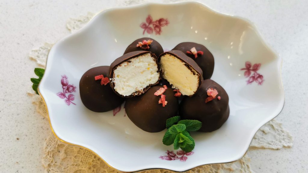 - Vizes kézzel golyókat formálunk belőle, ha akarod, meg is töltheted kemény lekvárral vagy gyümölccsel. Betesszük a mélyhűtőbe, kidermedni.