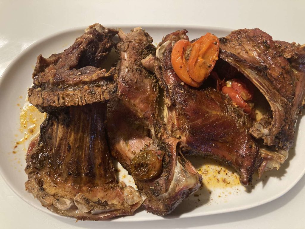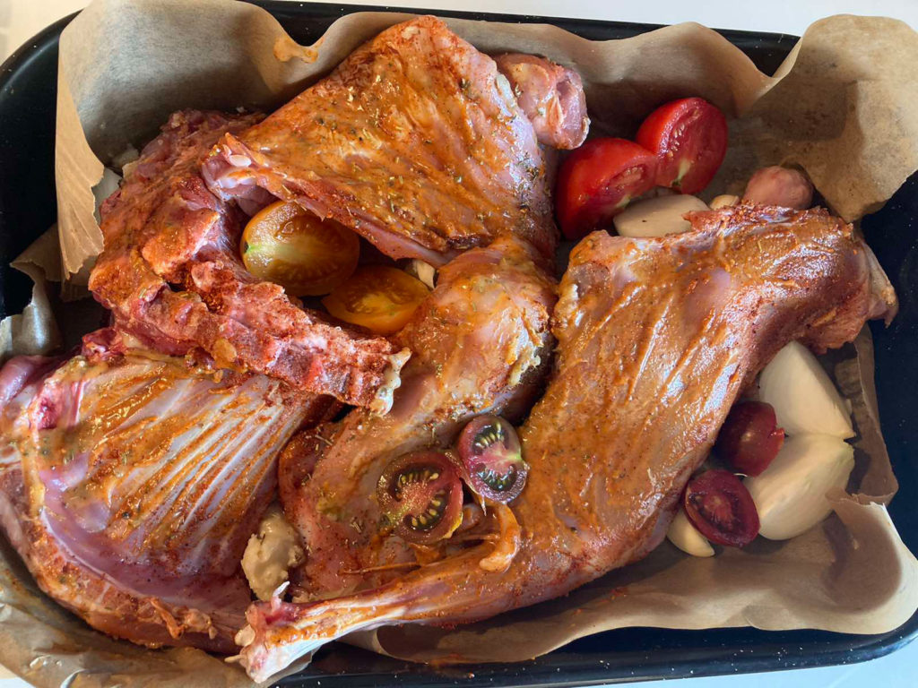 A kecskét egy nagy tepsibe teszem, megsózom, rárakom a félbevágott hagymákat, félbevágott paradicsomokat, fűszerezem, aláöntök két és fél dl húslevest. Alufóliával lefedem és kb. 160 fokon 3 órát sütöm. Félidőben meglocsolom a maradék húslevessel.