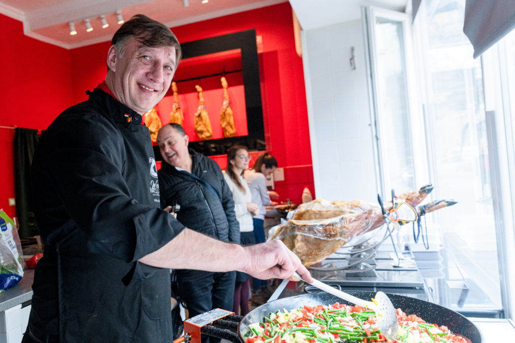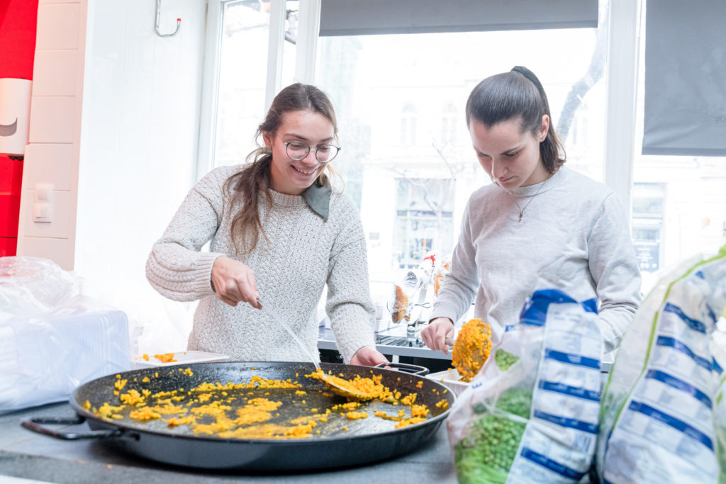 „Sergio Santoz: Amor mio” című dalának refrénje szűrődik ki az Oktogon melletti La Paella spanyol étteremből, amikor odaérek az ételosztásra. Olyan érzésem van, mintha nem is január elején, hanem a nyár közepén járnánk. Ebédidőre a nap is előbújt. Tóth Csaba étteremtulajdonos kora reggel óta a tűzhely mellett áll és tipikus déli temperamentummal, széles jókedvvel, no és gyakorlott mozdulatokkal készíti a spanyolok nemzeti ételét, a paellát.