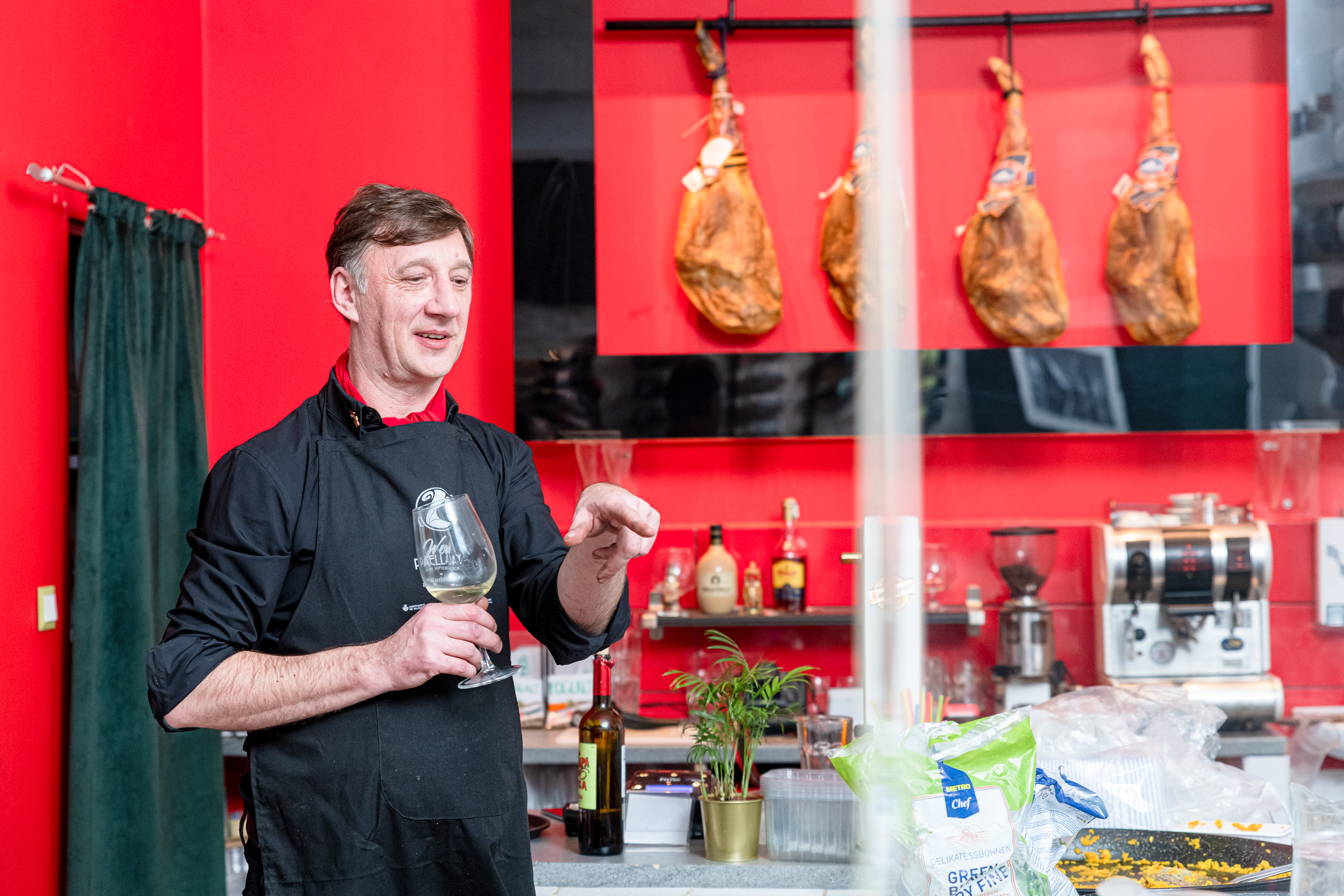 A padlón spanyol csempe, a falakon pedig az Almodóvar-plakátok világát idéző fekete-vörös dominál. Az enteriőr egyáltalán nem hivalkodó, a két oldalsó fal egyikén a rendelhető spanyol borok, a másikon három különböző spanyol sonka dekorálja a falat. A konyha gyakorlatilag a kirakatban van. Aki elhalad az étterem előtt, jól láthatja, ahogyan a széles serpenyőkben lustán és kényeztetően terül szét a napsárga sáfránnyal megbolondított gőzölgő rizses étel. Az utcára kiáramló illatok igen csábítók, pláne azoknak, akik sosem engedhetik meg maguknak azt, hogy betérjenek ide és egy jót egyenek. Ez a nap nekik és róluk szól, értük dolgozik ma az étterem tulajdonosa.