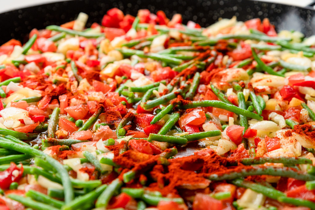Igen. A földművesek körében vált népszerűvé és tényleg került bele minden – éhínség idején állítólag még patkány is. A tipikus valenciai paellában tehát van csiga, nyúlhús és csontos csirkehús – én ezeket egyelőre kihagytam, a magyar vendégek többnyire ugyanis idegenkednek a csontos csirkehústól és általában a nyúltól is, nem beszélve a csigáról. Aggodalomra amúgy semmi ok, a kész paella így is nagyon finom és szaftos.
