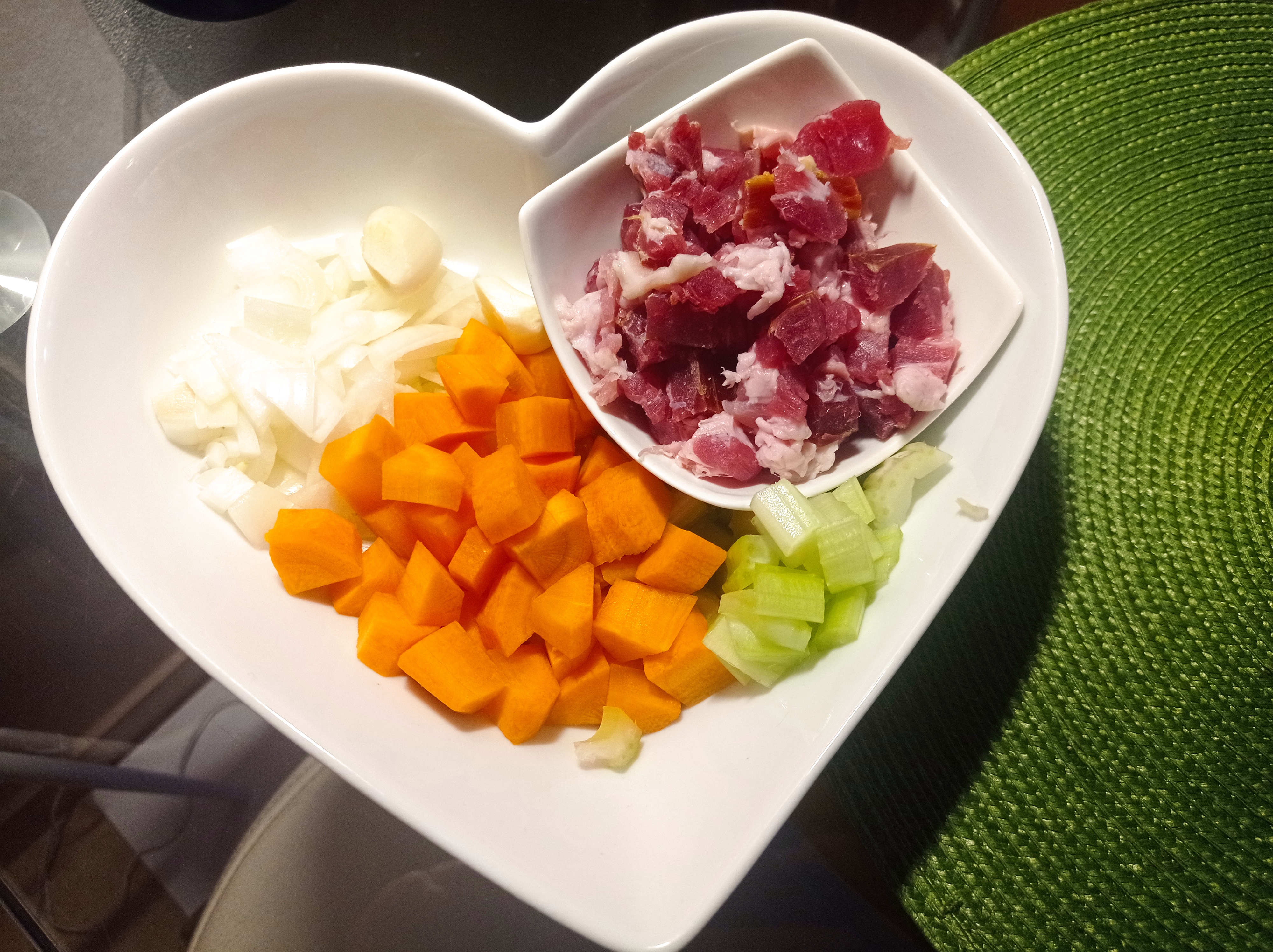- A szalonnát felvágjuk, a zsírját kiolvasztjuk, adunk hozzá kevés olívaolajat vagy vajat, és az apró kockákra vágott zöldségeket megpirítjuk rajta.