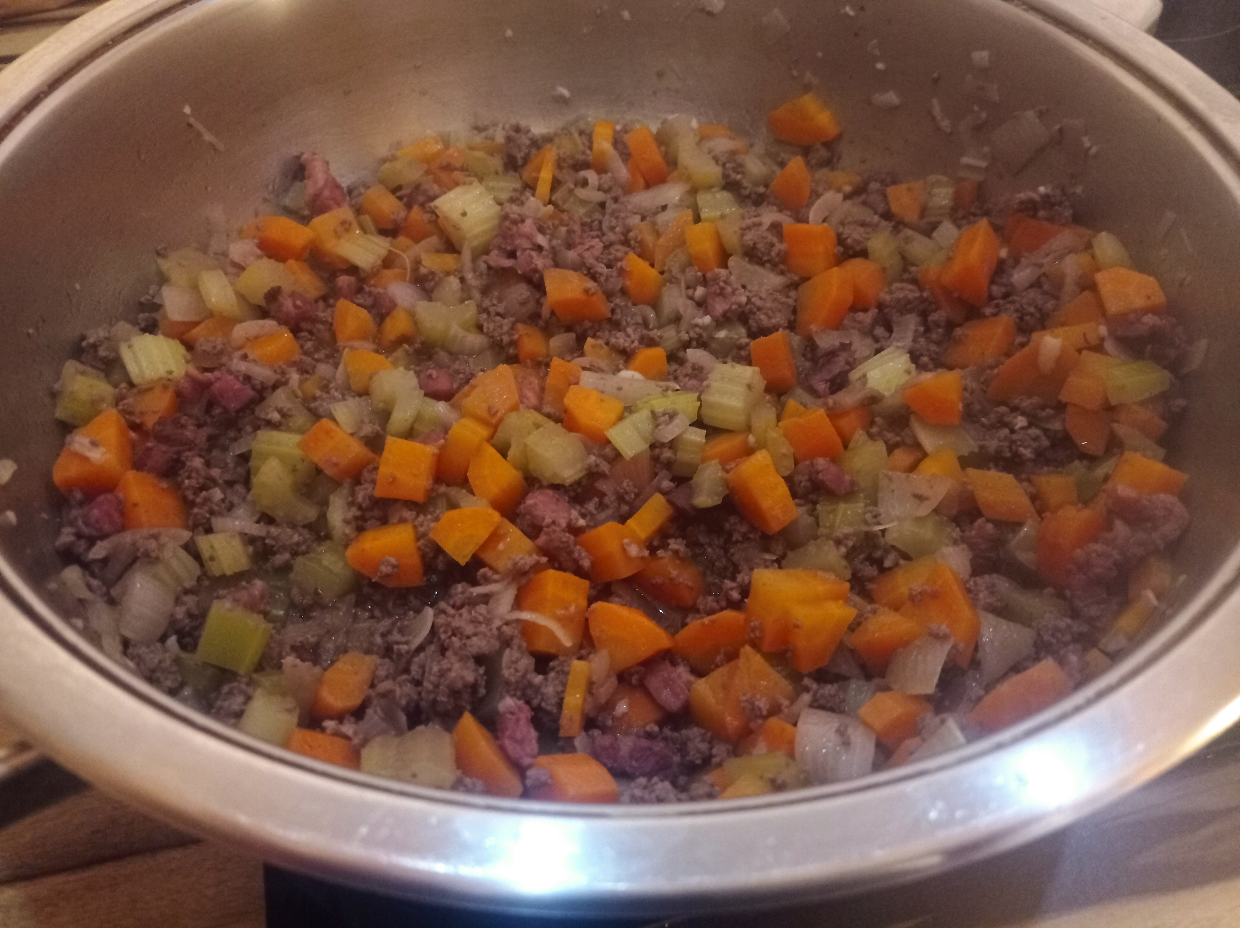 - Ha megpirultak, hozzáadjuk a darált marhahúst. Ha a hús is megpirult, adjuk hozzá a vörösbort. Mikor a bor teljesen elpárolódott, tegyük hozzá a paradicsomot is, fedjük le és hagyjuk főni lassú tűzön körülbelül 2 órát. Amikor szükségesnek látjuk, fokozatosan öntsük fel egy kis alaplével.