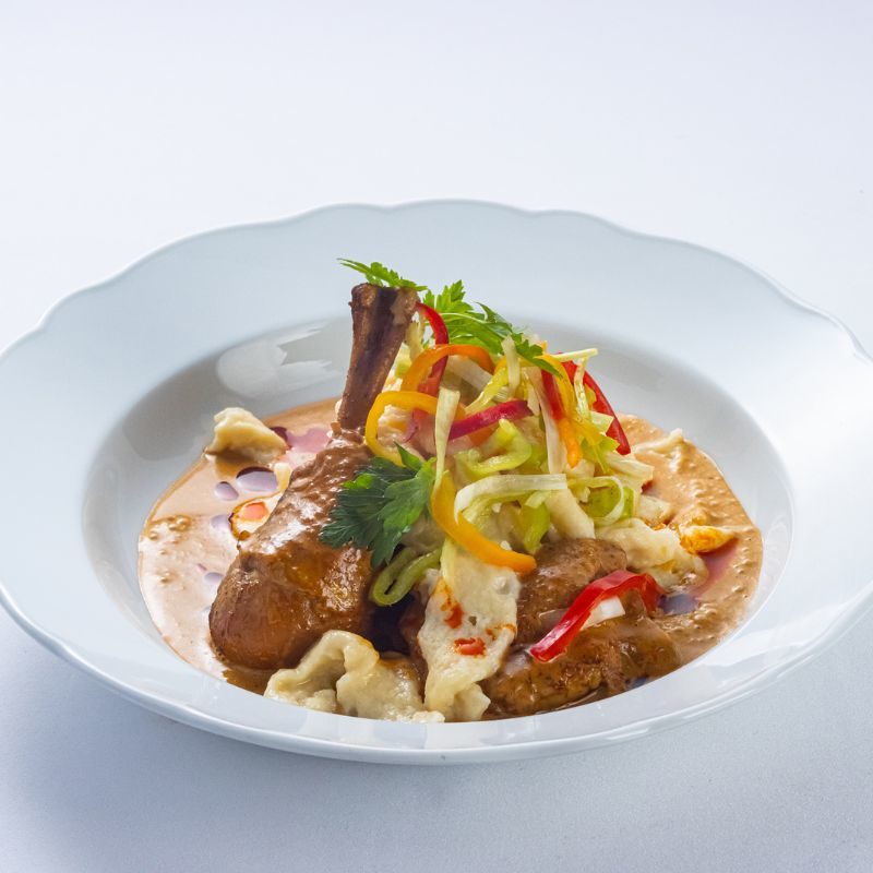 Paprikás csirke nokedlivel és tejfeles uborkasalátával (Fotó: Pintér Árpád, Gundel Étterem)