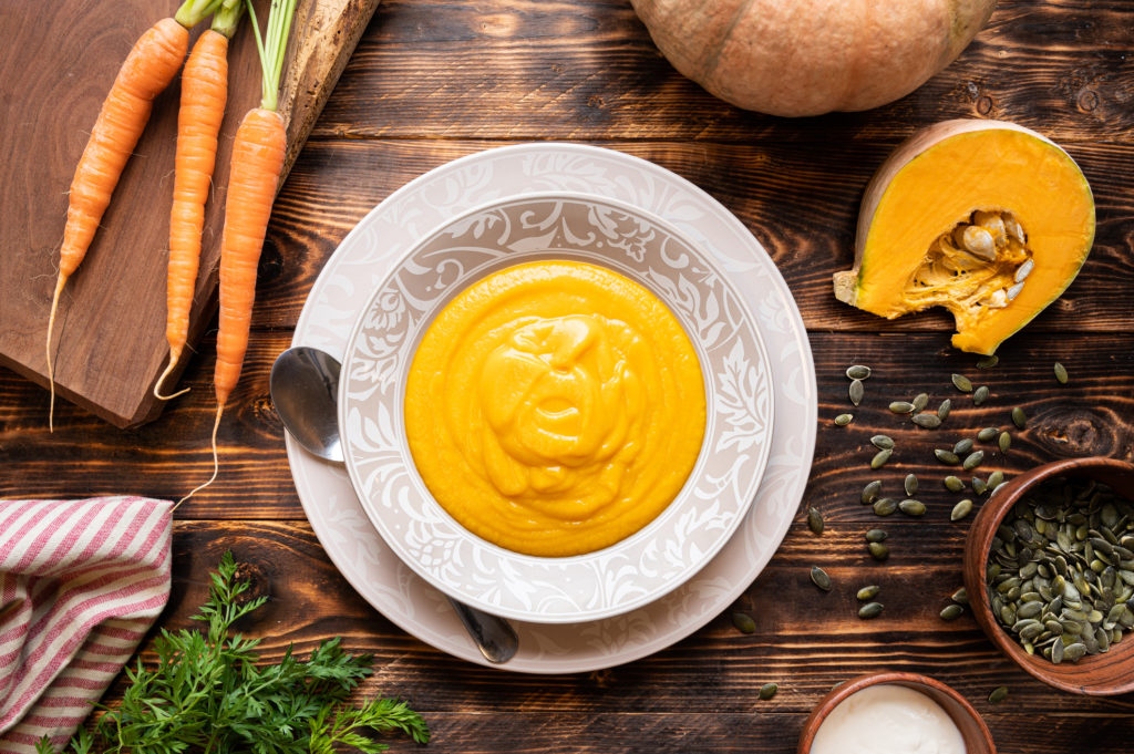 - Hámozzuk meg az édesburgonyát és a sárgarépát, hámozzuk meg és vájjuk ki a sütőtök magházas részét. Vágjuk fel őket nagyobbacska kockákra.