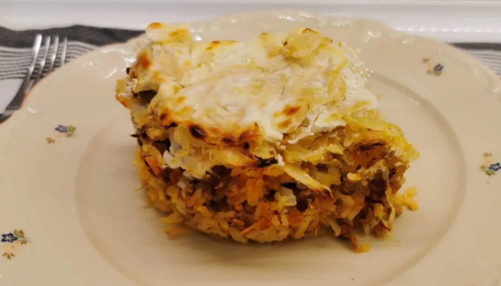 - Most zsírral kikenünk egy megfelelő méretű tepsit, és a tepsi aljára leterítjük a káposzta felét (mosottat és savanyút vegyesen), majd rátesszük a rizses húst. Rákenjük a tejföl felét, majd ráterítjük a káposzta másik felét, rákenjük a tejföl másik felét és betoljuk az előmelegített sütőbe.