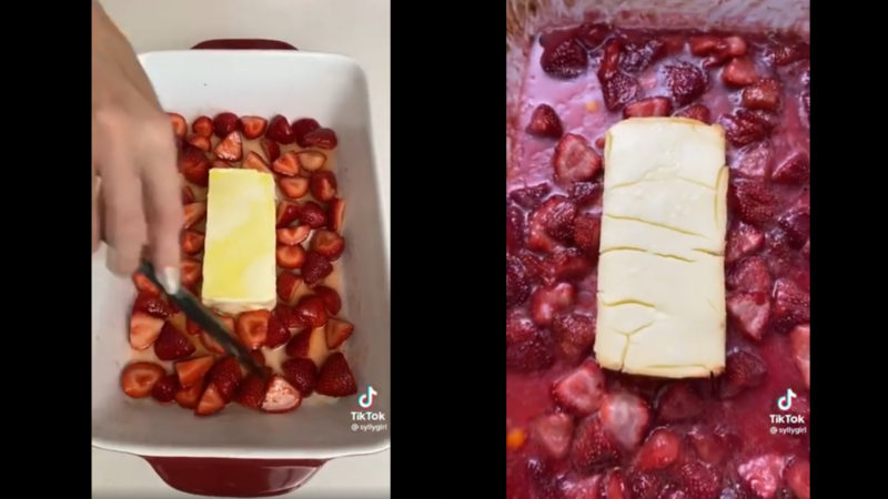 Az olívaolajjal locsolt krémsajt mellé eper kerül a sütőtálban, kap egy kis sót, sok cukrot, és összeolvasztják-sütik a sütőben. Végül csokipasztillákat szór bele a TikTokker, így lesz epres-csokis „sajttortás” krém belőle.
