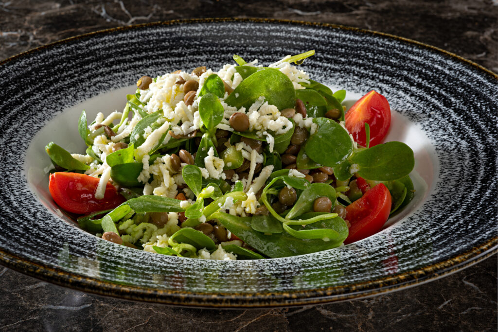 Fetás porcsinsaláta meleg lencsével