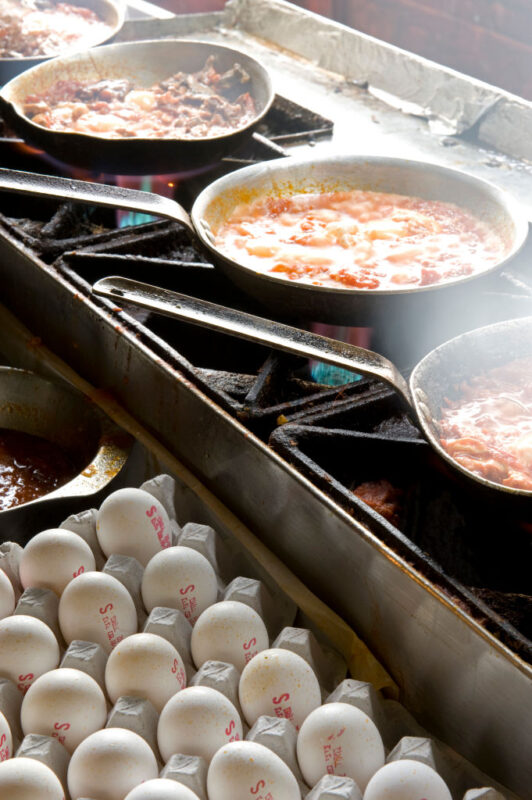 Kötelezően serpenyőben tálalva: készülnek a shakshukák a Dr Shakshuka étteremben, Jaffában / Fotó: Francois GOUDIER, Getty Images