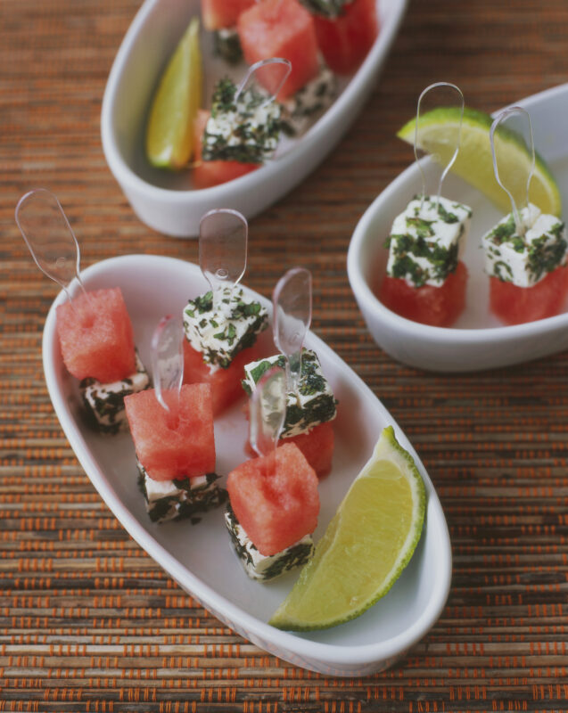 A nyári összejövetelek egyik kedvenc hideg előétele, ideális partifalatkának is. Ebben a párosításban szintén a sós-édes kontrasztja érvényesül, amit a rácsorgatott, fanyarkás citrom vagy lime leve frissít fel.